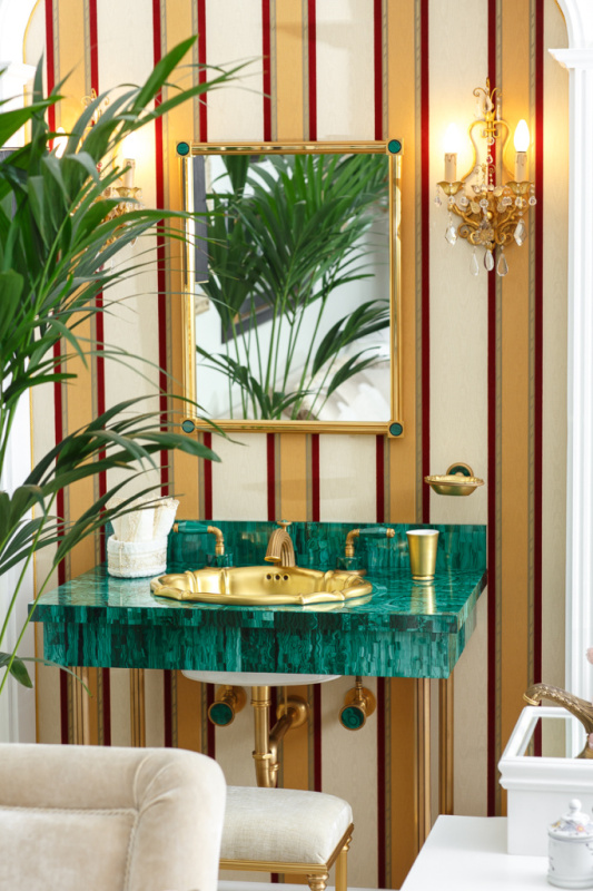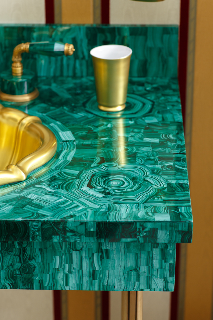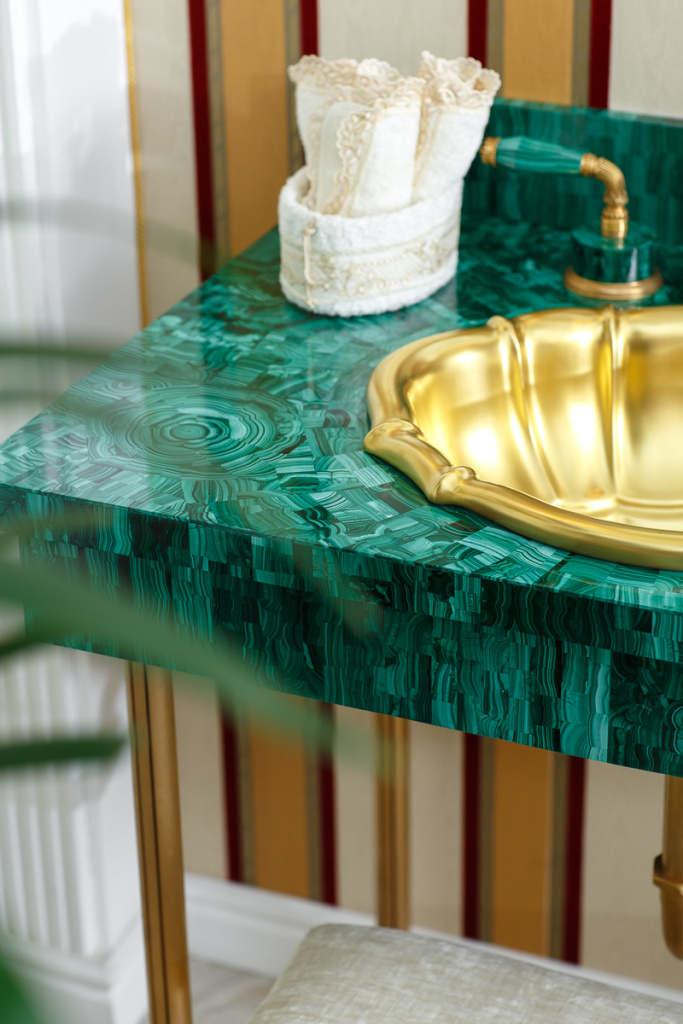 Поистине королевская консоль для оформления статусной ванной комнаты. Инкрустация натуральным малахитом, латуннные детали покрыты античным золотом. Керамическая встроенная раковина покрыта золотой эмалью.